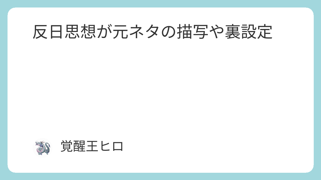 これは全てが偶然ではなく、反日思想が元ネタとなった必然の描写や裏設定といえるわけです。